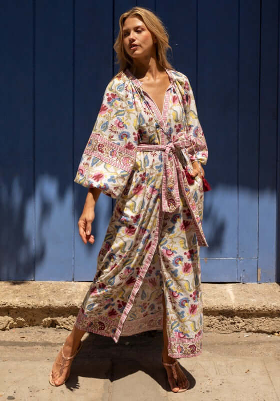 The Andrea Dress in White by resortwear designer Miss June features a v neckline and mirrored embellishments. With a contrasting paisley print and ladder details along the piping.  100% Cotton
