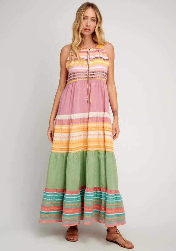 Look chic in the beautiful Alonissos Dress by resortwear designer Pearl & Caviar.   Made from soft cotton with contrasting panels, this sleeveless maxi dress features a tie neckline and a loose fitting tiered skirt.