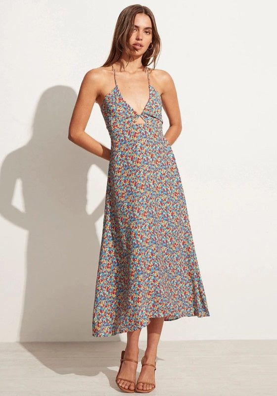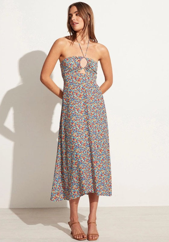 Look effortlessly chic in the beautiful Arles Dress in Mohina Floral print by Resortwear designer Faithfull the Brand.    This versatile summer dress in hand-painted floral print is a floaty midi length, with adjustable ties that can be styled in multiple ways, making this the perfect day to night dress.