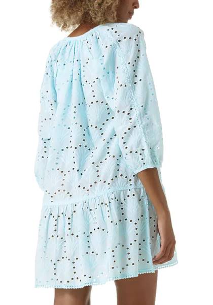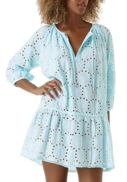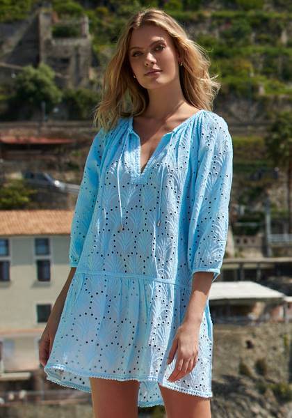 Look effortlessly chic in the beautiful Ashley Beach Kaftan in Sky Blue by beachwear designer Melissa Odabash. Made from soft lightweight rayon, this easy to wear kaftan features a v neckline and stunning broderie anglaise cut out detailing. This style is quite generous in sizing, we recommend that you size down.   100% Cotton.