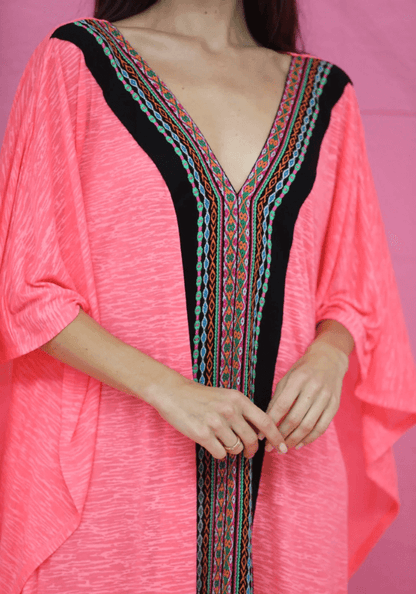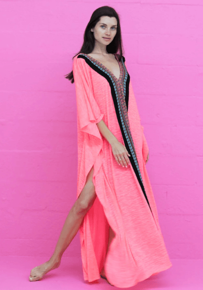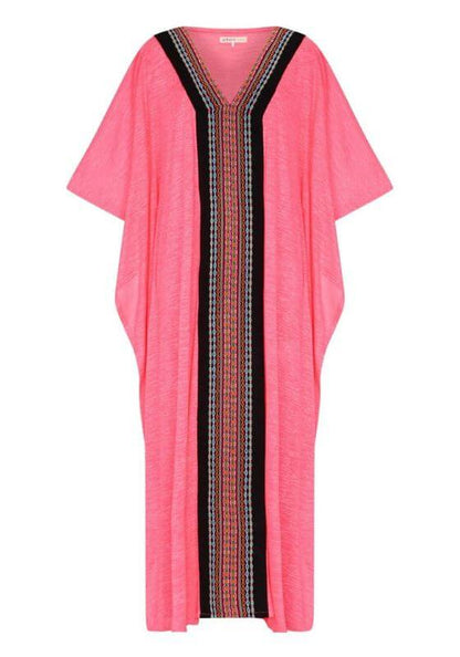 Look effortlessly chic in the Aurora Thobe in Pink by resortwear designer Pitusa. Featuring a deep V neckline with Inca trim detailing and relaxed flutter sleeves. The relaxed maxi style features a chic striped print with black finishing and side splits, the perfect beach kaftan. Available in one size fits 8-14, in two different lengths Petite (132cm) or Standard (139cm).