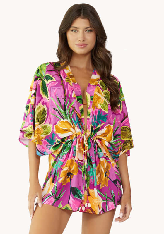 Designed for a tropical get away! The Bahama Beach Kaftan by beachwear designer PQ Swim will effortlessly take your vacation wardrobe to the next level. This versatile beach kaftan features wide cut sleeves and a draw string tie at the waist in a breathable lightweight fabric to create the perfect effortless fit. 55% RECYCLED VISCOSE 45% VISCOSE
