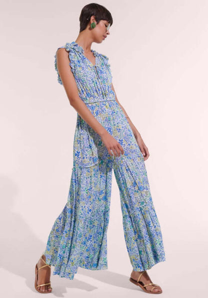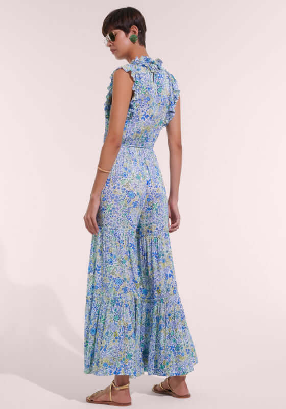 For an effortless summer look choose the Belene Jumpsuit from resortwear designer Poupette St Barth. In stunning blue and white floral print, the jumpsuit features a V neckline with feminine ruffled detailing on the shoulders and flattering tiered legs. The Belene Jumpsuit is a must have addition to your summer wardrobe.