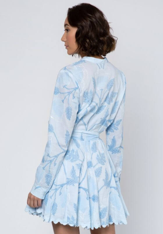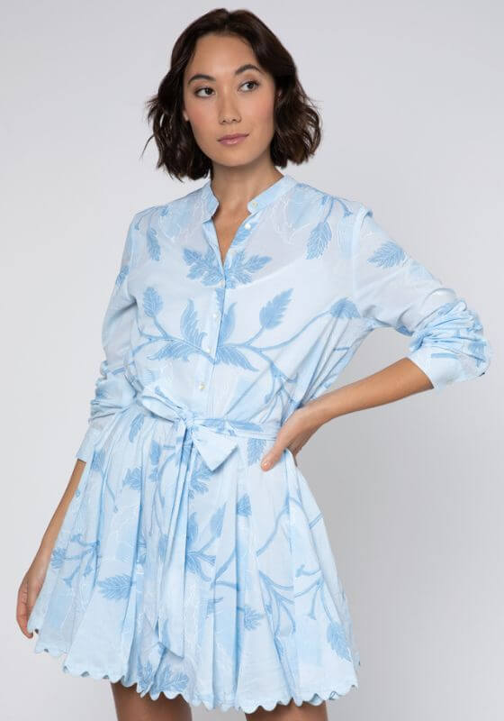 This Bellflower Godet Dress in Light blue by designer Juliet Dunn. This is perfect romantic beach dress and ric rac edging this shirt dress will become your go-to summer outfit. The tie waist flatters your figure whilst being adjustable. The bellflower block print with trailing in a pale blue colour is perfect for sunny summer holidays or afternoons in a pub garden with a rosé.  100% Cotton