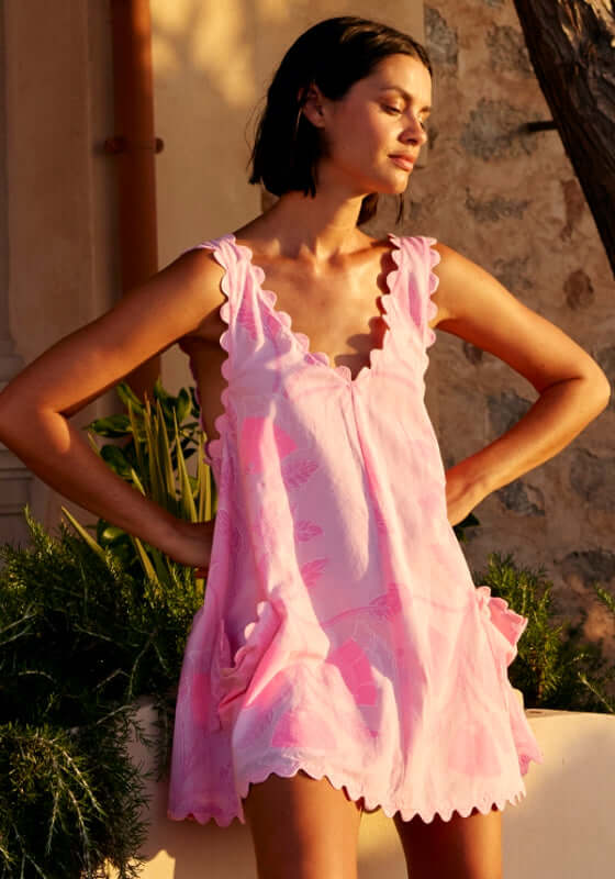 Complete your poolside look with the Bellflower Low Back Dress in Pink by beachwear designer Juliet Dunn. In Juliet Dunn’s popular Bellflower print cotton with scalloped trim, this one size mini dress is lightweight and roomy, perfect for beach walks and poolside lunches. . Available in one size fits 8-12 UK.