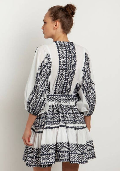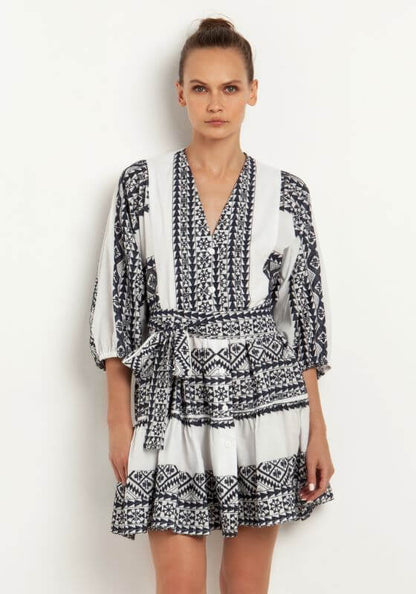 Turn heads in the stunning Belted Mini Dress with Triangle Embroidery by resortwear designer Greek Archaic Kori.   This beautiful mini beach dress in white cotton with navy embroidered, features a v neckline with belt at the waist and a tiered skirt. Greek Archaic Kori run much larger so we recommend sizing down. Perfectly styled with boots and tights during the winter time!