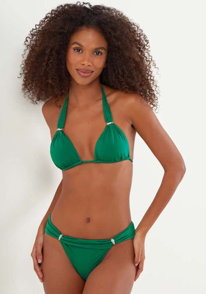 Look stylish in the classic Reflection Bia Bikini by beachwear designer Vix. Vix’s bestselling Bia triangle top with adjustable gold hardware and optional padding provides the perfect fit for all bust sizes. The bottoms offer a medium coverage with the same sliding silver hardware detailing. Pair this Triangle Bikini with matching Reflection Mita Coverup for a chic beach look.