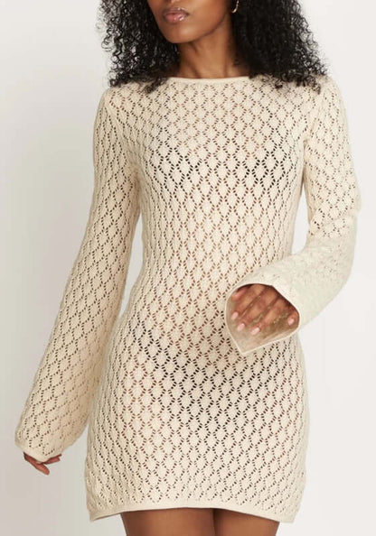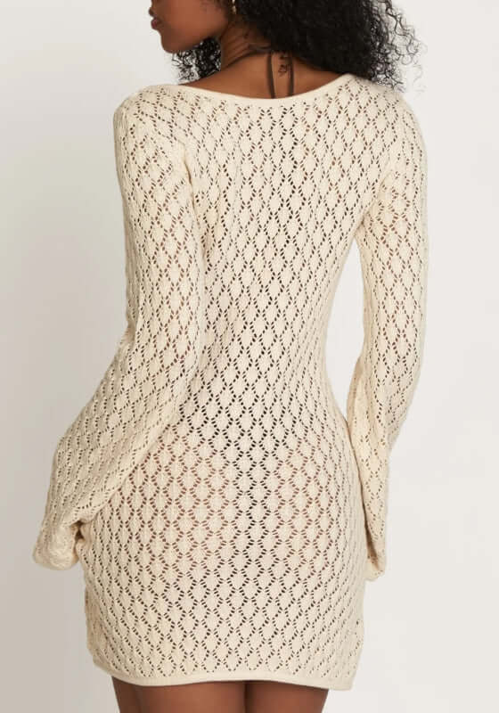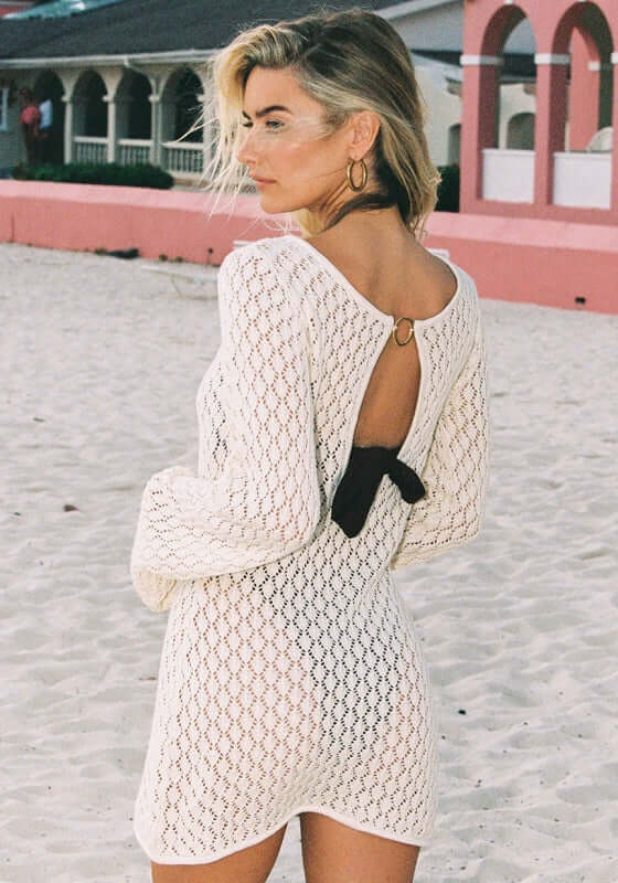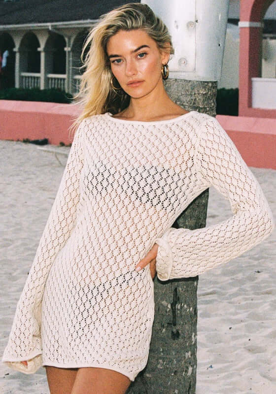 The Bimini dress in ivory by swimwear designer Away That Day is the perfect beach essential. Made from 100% organic cotton, it offers unmatched comfort and style. Its bell sleeves and white pearl buckle add a touch of sophistication to any holiday look. Versatile enough to wear two ways, this beach dress is a must-have for your swimwear collection.