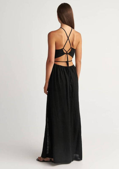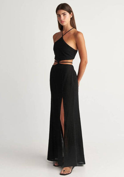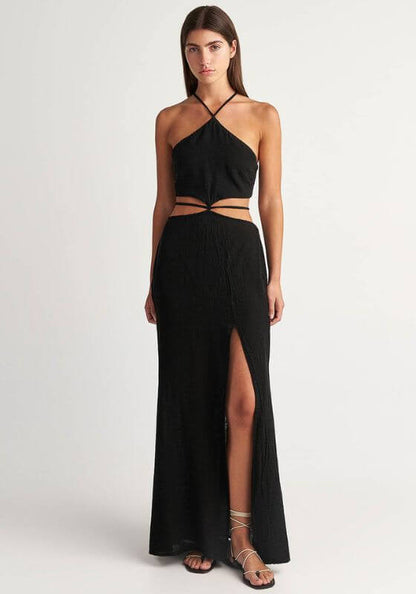 Make a statement in the Black Cut Out Dress by beachwear designer Pearl and Caviar. This summer dress is a must have for your next summer occasion! Featuring a halter necktie with cut out waist detailing and a low back tie. Finished with a straight cut skirt.