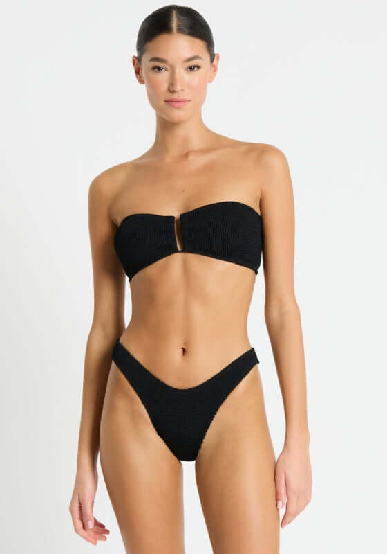Look chic in the classic Blake Bikini in black by swimwear designer Bond Eye. Made from stretchy crinkle fabric, this stylish pull on bandeau top features a curved u bar detail in the centre for shape and support.   The bottoms offer medium coverage, and can be worn on the hips or pulled up to create a high legline. Bond Eye swimwear is made from a sculpting supportive crinkle fabric designed to fit sizes from 8-14.
