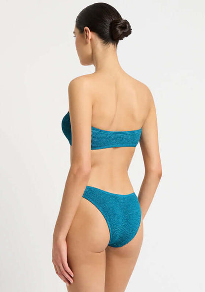 Look chic in the classic Blake Bikini in Ocean Shimmer by swimwear designer Bond Eye. Made from stretchy crinkle fabric, this stylish pull on bandeau top features a curved u bar detail in the centre for shape and support.   The bottoms offer medium coverage, and can be worn on the hips or pulled up to create a high legline. Bond Eye swimwear is made from a sculpting supportive crinkle fabric designed to fit sizes from 8-14.