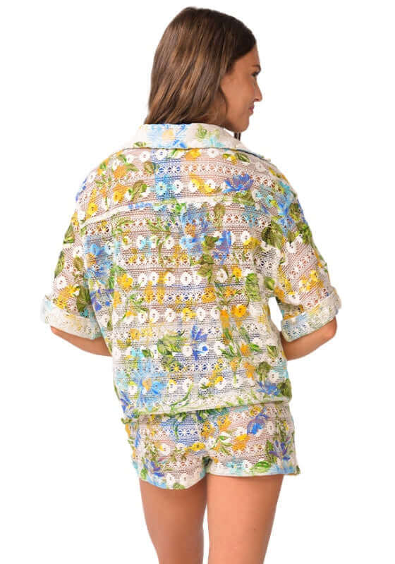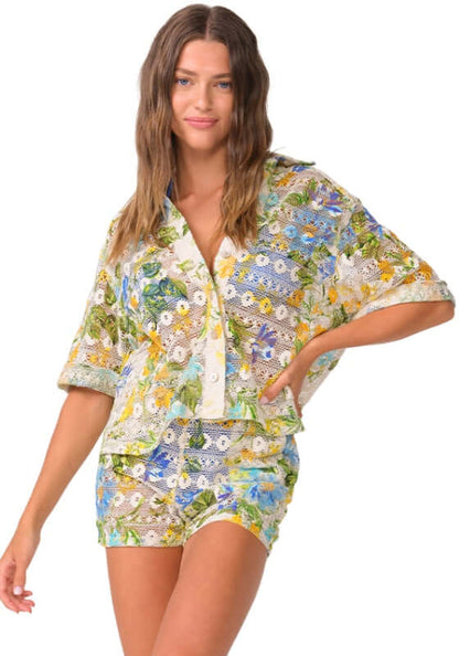 Introducing the Blake Beach Shirt in Bluebell by beachwear designer PQ Swim - the perfect mix of casual and put-together. Made from creamy lace fabric, its airy, collared design and button down front elevate any look. Complete the set with its matching bikini and shorts for effortless comfort.