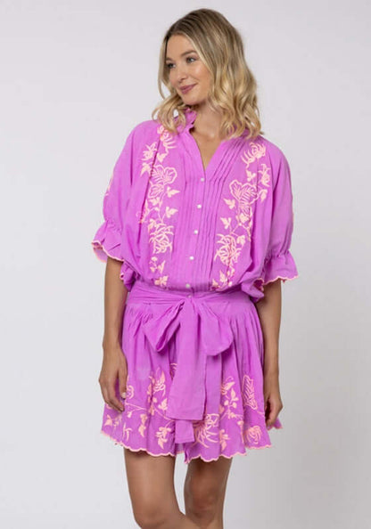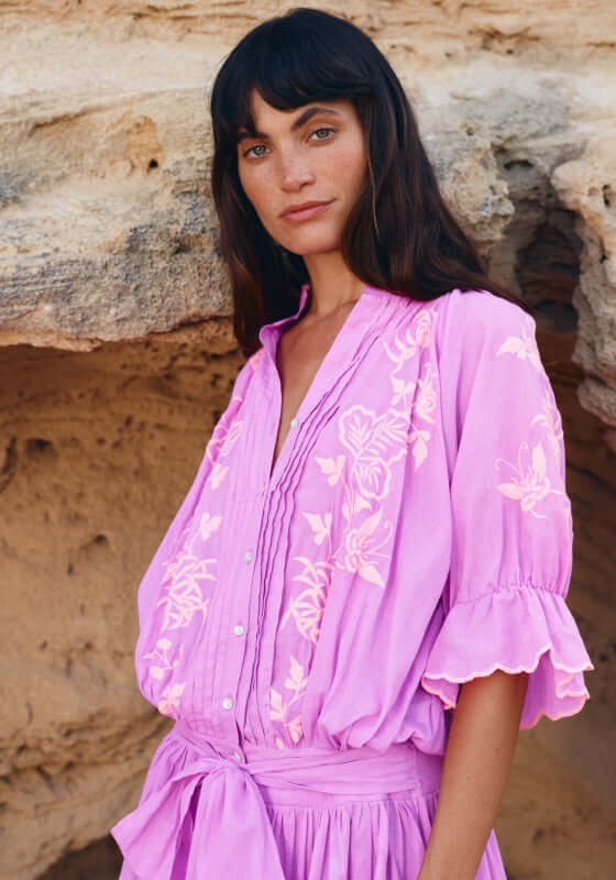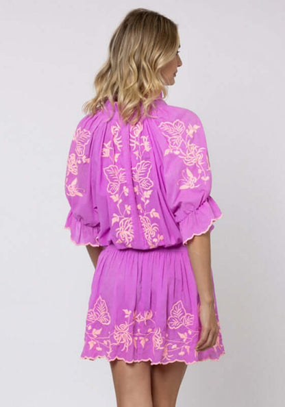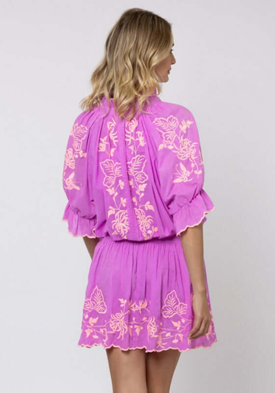 Turn heads in Juliet Dunn’s bestselling Blouson Dress updated for 2025 in a violet Butterfly Embroidery Print with a pink scalloped hem. This must have style features a button down front with pintuck detailing, short puff sleeves finished with tiny scalloped edging and an elasticated waist with bow detail. The versatile dress can be worn everywhere from the beach to hot summer days in the city.