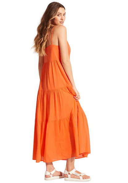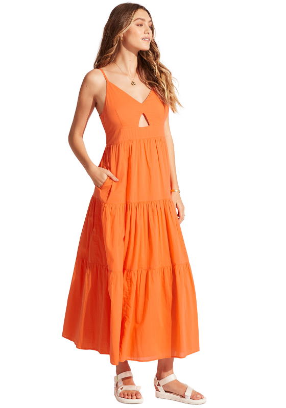 Add a pop of colour to your summer wardrobe with the By the Sea Maxi Dress in Mandarin by beachwear designer Seafolly.    Made from soft gauze cotton, this effortless maxi dress features a cut out detail in the centre, along with delicate spaghetti straps and a tiered skirt.