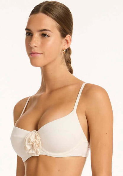 Make a statement in the Casa Del Mar Flower Balconette Bikini Top in coconut by swimwear designer Sea Level. This classic shape has been elevated with a three-dimensional rosette at the centre of the top. Featuring adjustable straps for extra support.