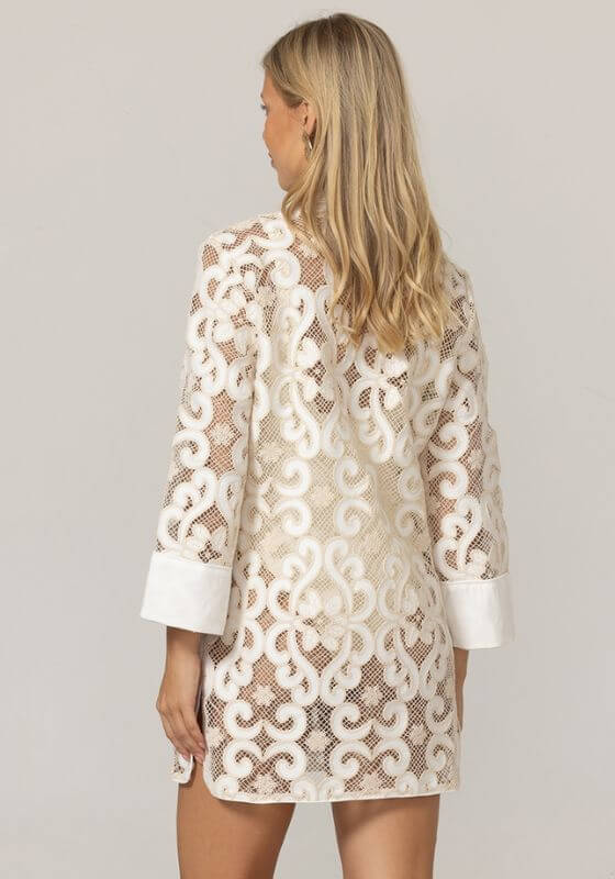 Crochet, this seasons summer essential! The Chandra Kaftan in white by resortwear designer Miss June will be your new go to mini dress, featuring long sleeves and a v neckline with embroidered details, comfortable and perfect for a beach to beach bar boho vibe.  It’s a versatile and stylish piece that you’ll love wearing all summer long. Available in one size fits most from size UK 8 – 14