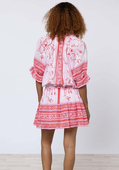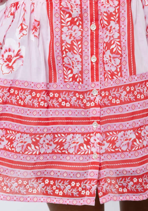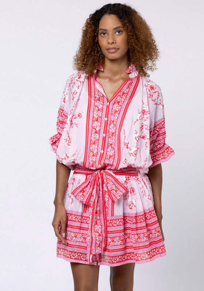 Turn heads in Juliet Dunn’s bestselling Blouson Dress updated for 2025 in Cherry Blossom print.  This must have style features a button down front with pintuck detailing, short puff sleeves finished with tiny scalloped edging and an elasticated waist with bow detail.   The versatile beach dress can be worn everywhere from the beach to hot summer days in the city.