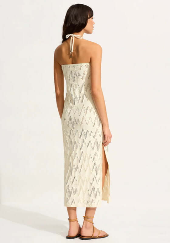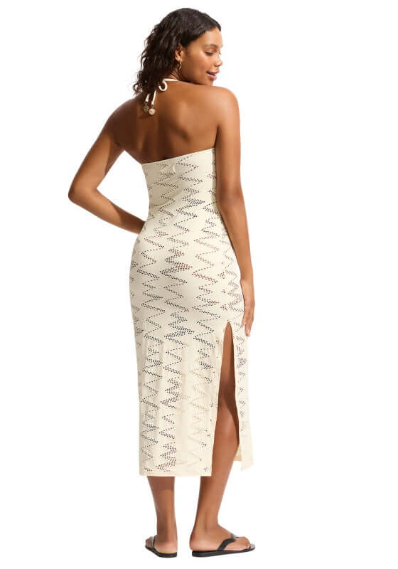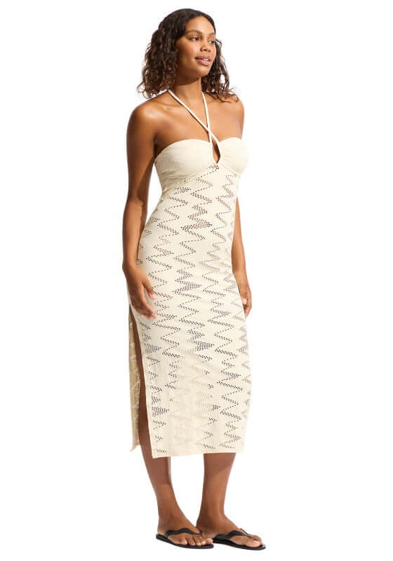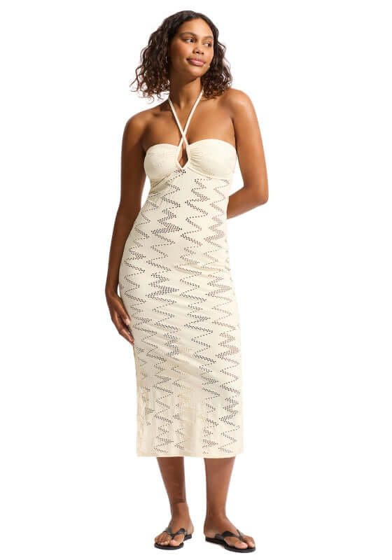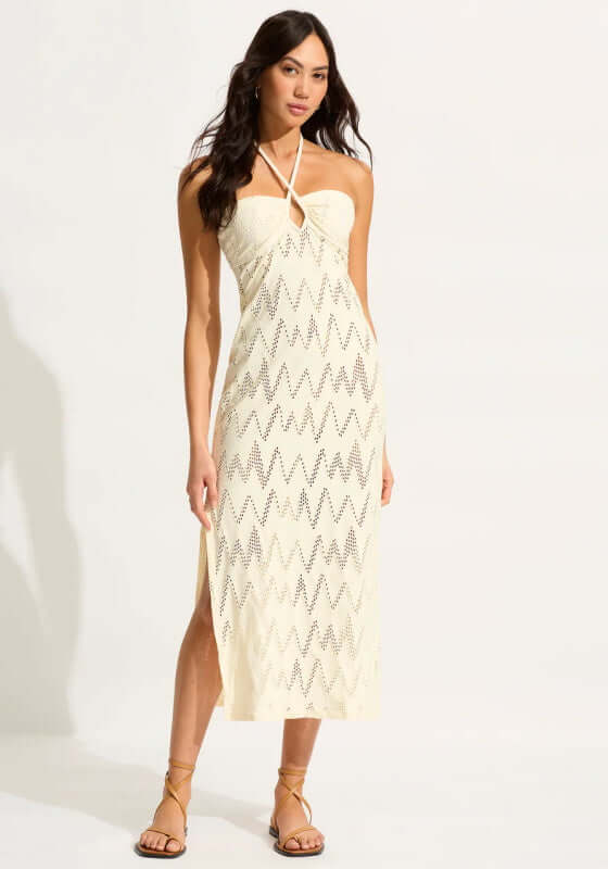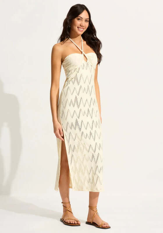 Make a statement in the Chiara Dress in Ecru by beachwear designer Seafolly. This stunning mid length beach dress features a multi-tie neck tie and side slit. In a stunning zig zag navy mesh design developed in house and knitted in Brazil this will your new go to beach dress.