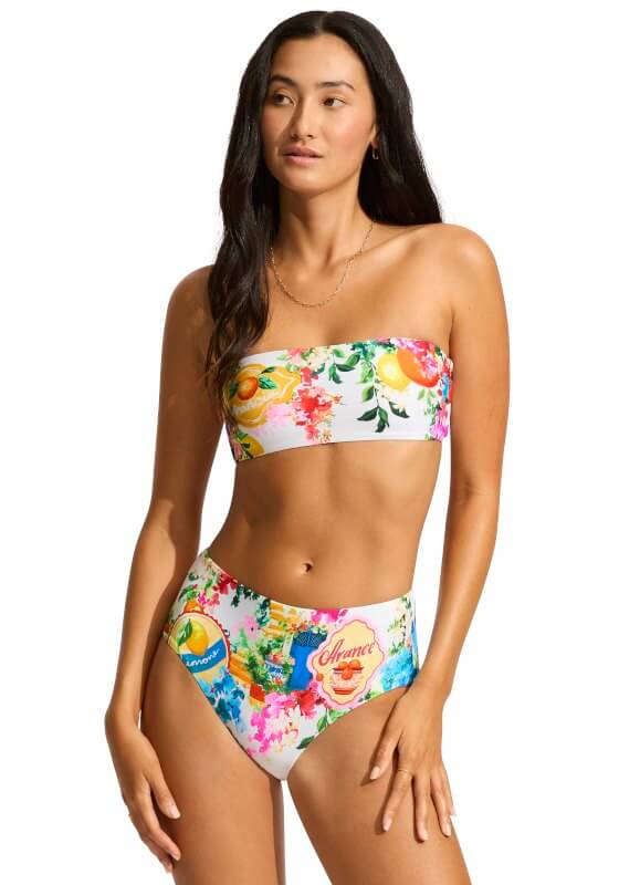 The Ciao Bella Bandeau Bikini Top by Seafolly features a vibrant summer print and a stylish gold clasp at the back, combining chic design with secure fit. Perfect for sunny days at the beach, its bandeau style offers a flattering, comfortable look that pairs effortlessly with your favourite swimwear. Enjoy timeless elegance and effortless summer vibes with this standout piece.