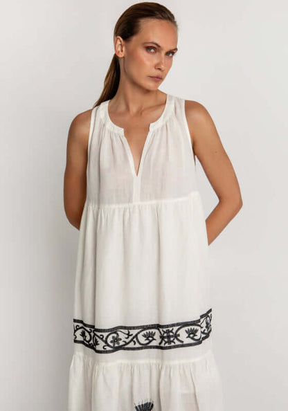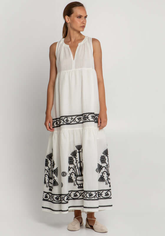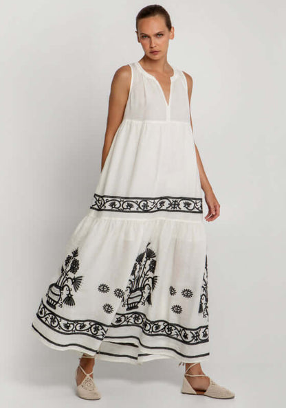 Look effortlessly chic in the Crete Sleeveless Maxi Dress in Natural and black by Resortwear designer Greek Archaic Kori. This simple shape summer dress features a tired skirt with a v neck line and elevated with black embroidery detail. The perfect dress to take you from a walk around the city to the beach.
