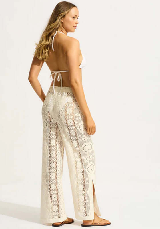 The Crochet Pant in cream by swimwear designer Seafolly Swimwear will elevate your holiday wardrobe. Featuring a relaxed wide leg fit these trousers are perfect to wear over your favourite bikini to complete your beach club look! Made from 100% Cream Cotton.
