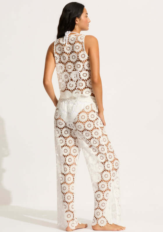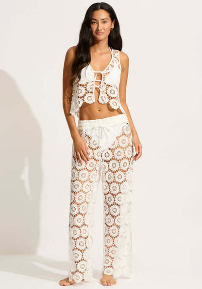 The Crochet Pant in White by swimwear designer Seafolly Swimwear will elevate your holiday wardrobe. Featuring a relaxed wide leg fit these trousers are perfect to wear over your favourite bikini to complete your beach club look!