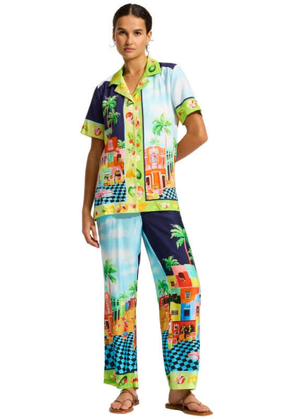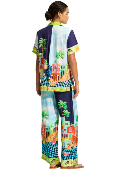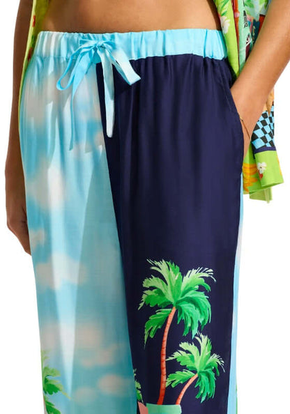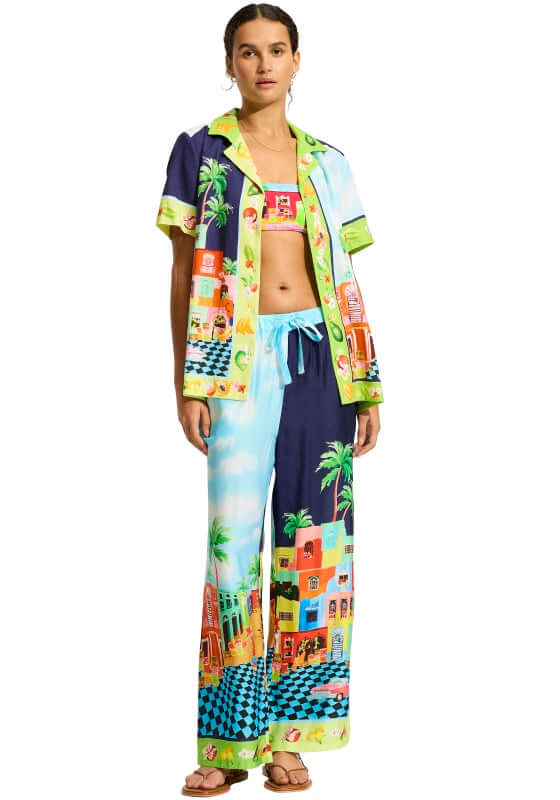 The Cuba Pant by beachwear designer Seafolly will be your new go to holiday outfit! This wide leg pant featuring a drawstring waistband with a relaxed leg for a flattering and effortless look. Designed to be worn as a co-ord  with the Cuba Beach Shirt.