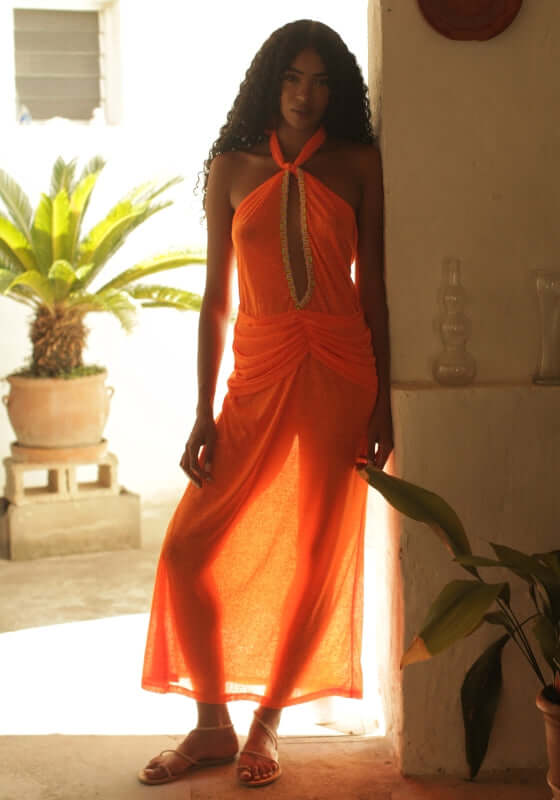 The Cutout Halter Ruched Maxi Beach Dress in tangerine by beachwear designer Pitusa is the perfect maxi for an evening stroll along the beach. The beach dress features a flattering ruched waist and a plunge cutout finished with a wavy trim. The halter neck straps can be tied and styled in multiple ways, offering versatility in coverage. Available in one size (fits 8-14) in 2 lengths Petite & Standard. Length: Standard 54.2in / 139cm | Petite 53.2in /136cm from shoulder.  65% Poly 35% Viscose