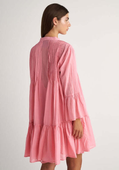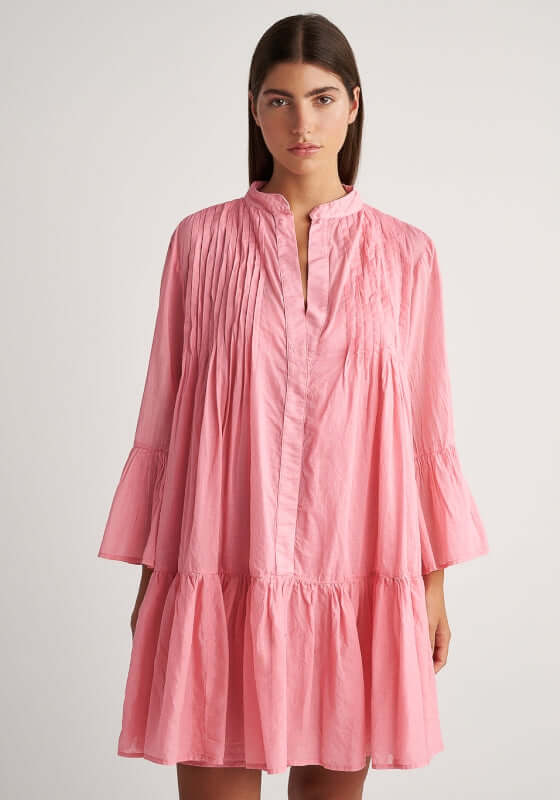 Look chic in the beautiful Daphne Pintuck Beach Dress in pink by resortwear designer Pearl & Caviar.   This effortless dress in soft pink cotton, features a v neckline with pintuck detail and a loose fit tiered skirt.