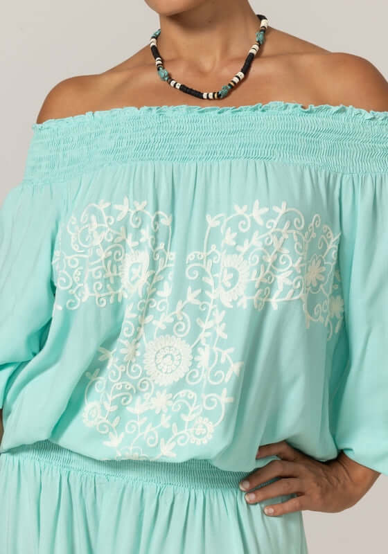 Look chic in the beautiful Eleyna Dress in Aqua by resortwear designer Miss June.  This elegant white and aqua dress features an off shoulder neckline and embroidered detailing with balloon sleeves.