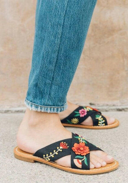 Look chic in the stylish Embellished Floral Sandals by Soludos. These elegant sandals feature a cross over front embellished with embroidered floral detailing, with a comfortable leather sole.