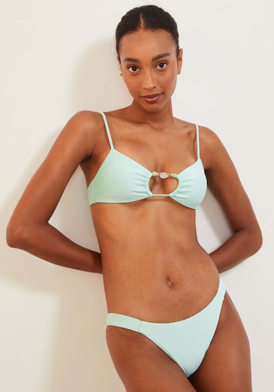 Turn heads in the Erin Bikini Mint from swimwear designer Vix. The bralette bikini top features delicate stone and gold hardware details, with adjustable shoulder straps, removable pads and tie back closure.