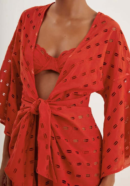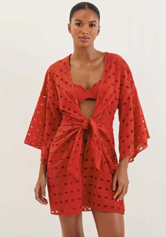 Elevate your poolside look with the Perola Beach Kaftan in Ruby by swimwear designer Vix. This must have beach cover up features a tie waist and wide fluted sleeves to create an elegant silhouette. Layer it over the matching Eyelet Naya Triangle Bikini for an effortlessly chic beach look.