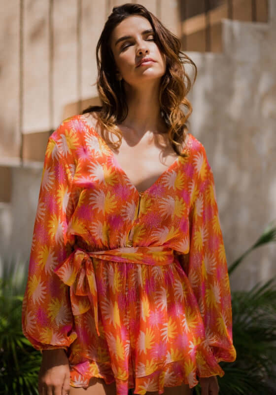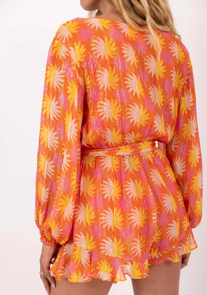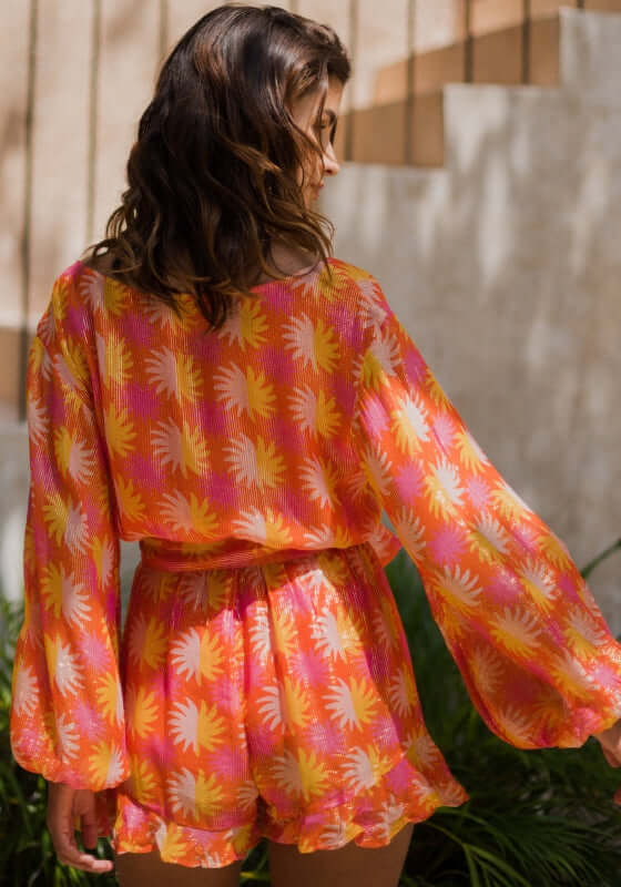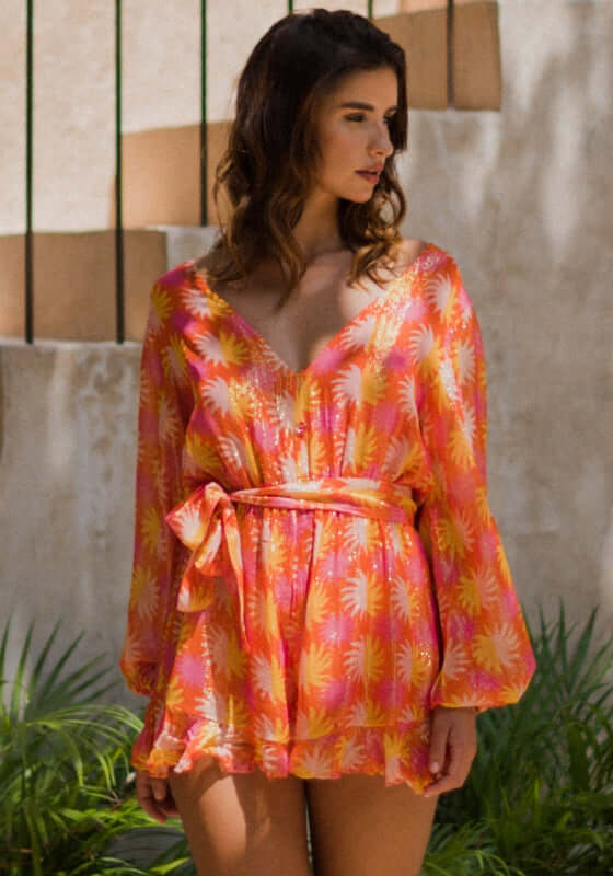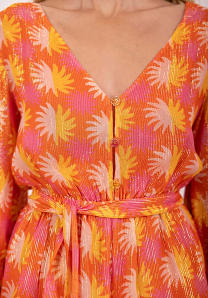 Introducing the Fleur Jumpsuit Marbella Yuma by beachwear designer Sundress. An exclusive Sundress print adorned with shiny threads. This short jumpsuit features an adjustable waist and a V neckline with flower buttons. The light, flared sleeves are gathered at the cuff, while gathered flounces run along the short hem. Tie the separate belt to complete the look.