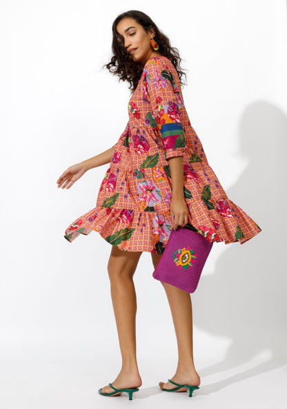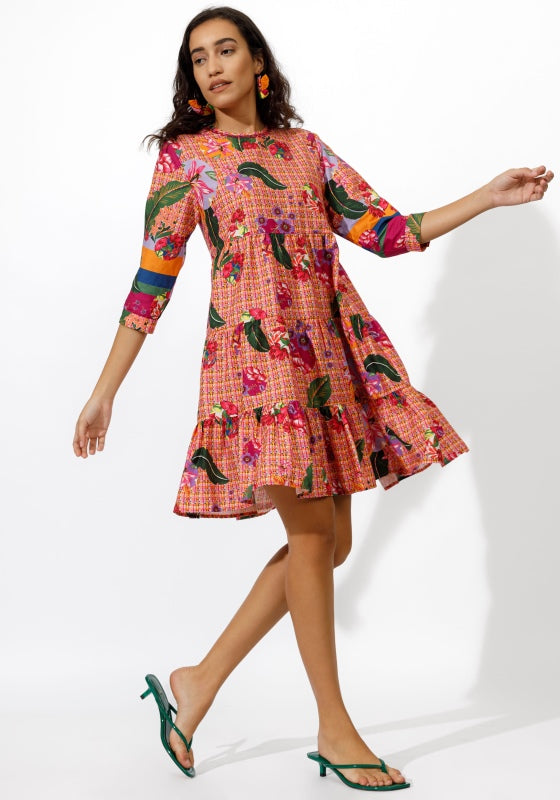 Make a style statement in the Floral Print Mini Dress in Pink by Emily Lovelock.  Made from crisp cotton in a bold tropical print, this chic mini dress features ½ length sleeves with contrast stripe detail and a tiered skirt.