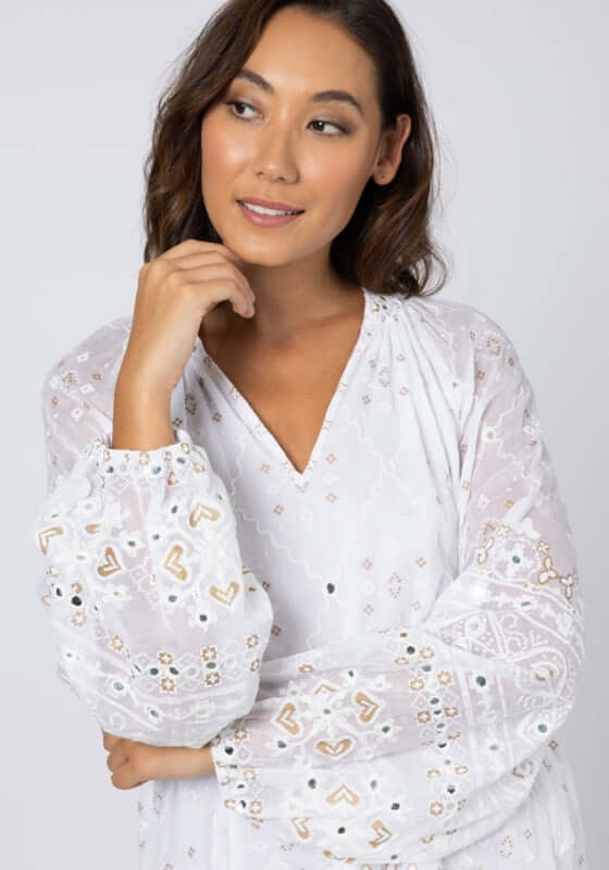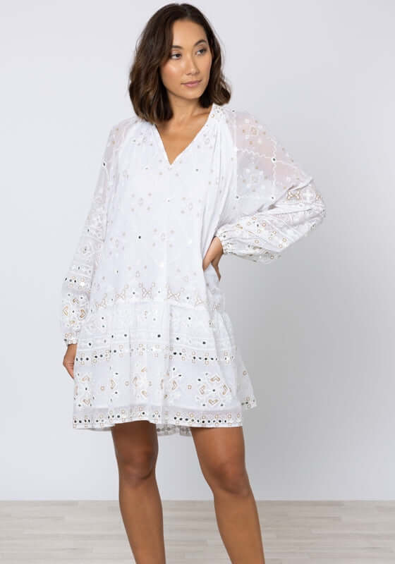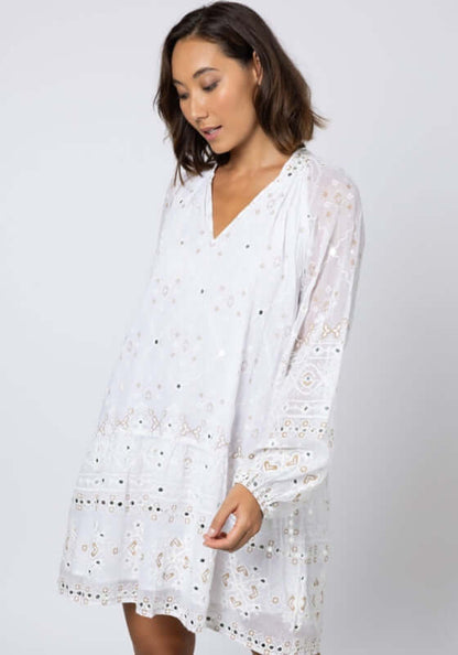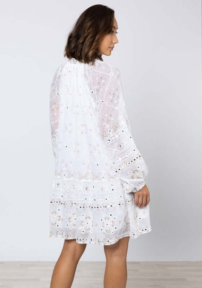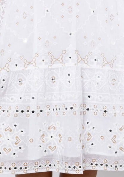 Get ready to turn heads in the embroidered Frill Dress in Mosaic White by resortwear designer Juliet Dunn. The mini dress features a unique mosaic print in white that is both eye-catching and on-trend. Perfect for your next resort vacation or summer outing, this beach dress will have you feeling stylish and confident.