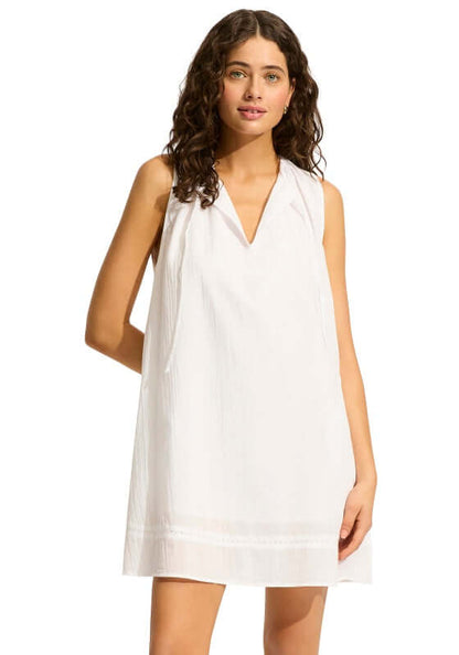 The Gathered Neck Mini dress in white by Seafolly is the perfect beach dress to add to your wardrobe. Made of 100% organic cotton, it's soft and comfortable for all-day wear. The mini length, drawstring neck tie, and side pockets make it both stylish and functional.