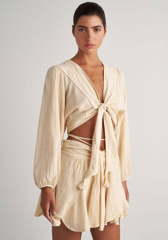 Look effortlessly chic in the Gauze Skort by resortwear designer Pearl & Caviar. Made from soft cotton in a pale yellow textured fabric, this stylish mini beach skirt features a tie waist, with an assumetric .