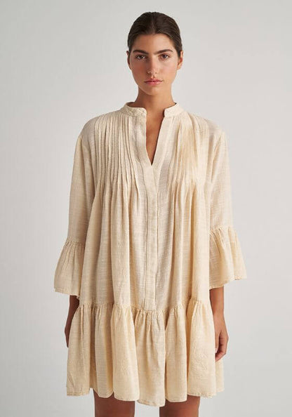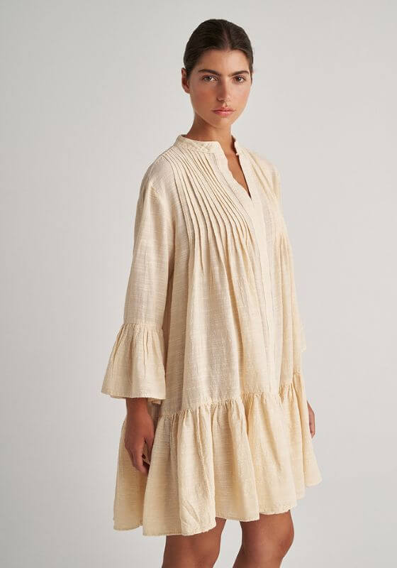 Look chic in the beautiful Gauze Pintuck Dress in butter by resortwear designer Pearl & Caviar. This effortless dress in soft yellow cotton, features a v neckline with pintuck detail and a loose fit tiered skirt.