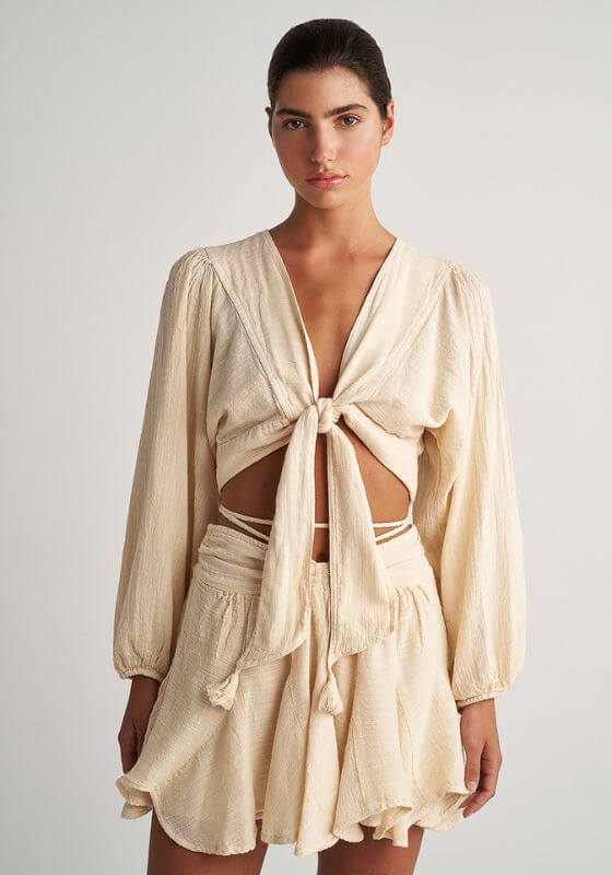 Look effortlessly chic in the Gauze Tie Front Top by resortwear designer Pearl & Caviar. Made from soft cotton in a yellow textured fabric, this stylish beach top features a tie front and blouson sleeves.