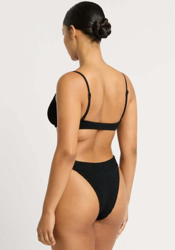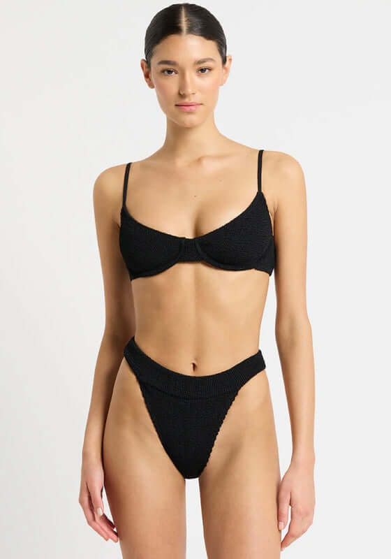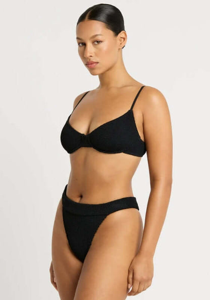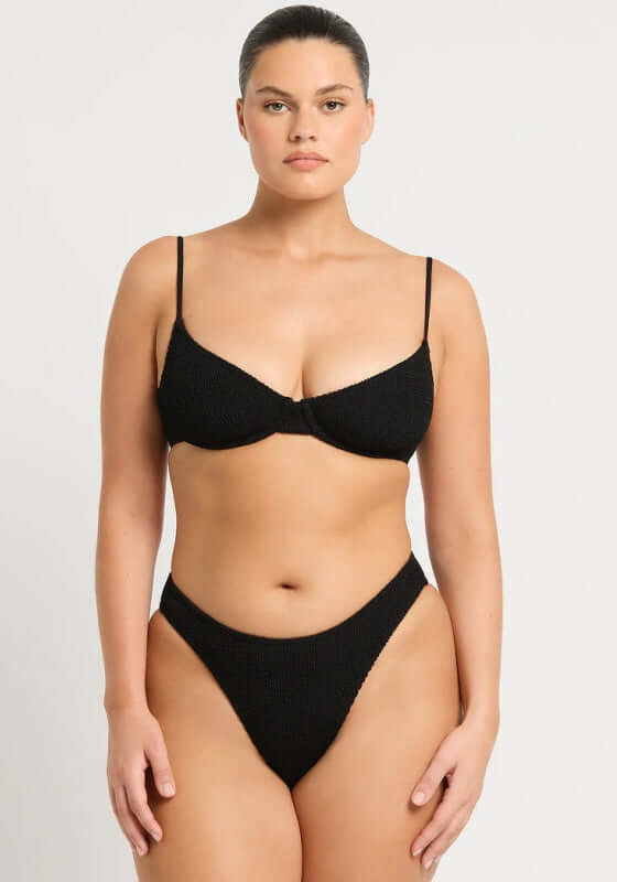 Look chic in the beautiful Gracie Bikini in black by swimwear designer Bond Eye. In stretchy crinkle fabric this black bikini, features a flexible underwire in the supportive top and adjustable straps making this suitable for an A-DD cup. The bottoms offer medium coverage and can be worn on the hips or pulled up to create a high legline. Bond Eye swimwear is made from a sculpting crinkle fabric designed to fit sizes from 8-14.