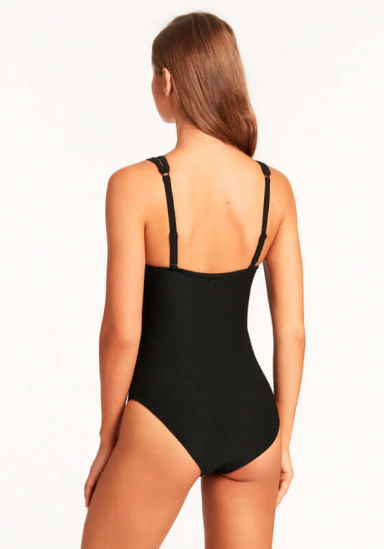 Feel like the most confident version of yourself in the Honeycomb Spliced Swimsuit in black by swimwear designer Sea Level. In this season must have waffle texture to elevate the classic black cutout swimsuit silhouette, featuring a stretch ladder trip detail to complete the chic look. With removable padding, adjustable and convertible straps this is the perfect swimsuit to create the perfect fit on all body shapes.