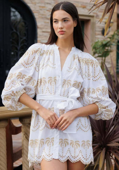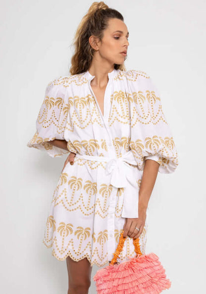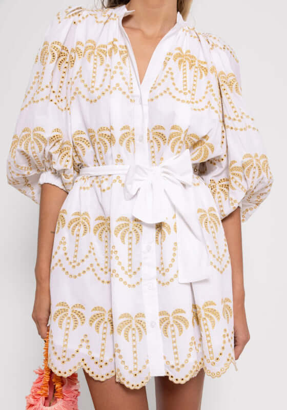 Turn heads in Resortwear designer Sundress’ Inaya Dress in their exclusive palmtree eyelet fabric. This must have style features a button down front with pintuck detailing, short puff sleeves finished with a removable belt. The versatile summer dress can be worn everywhere from the beach to hot summer days in the city.