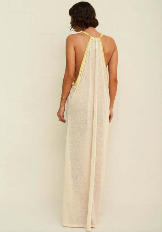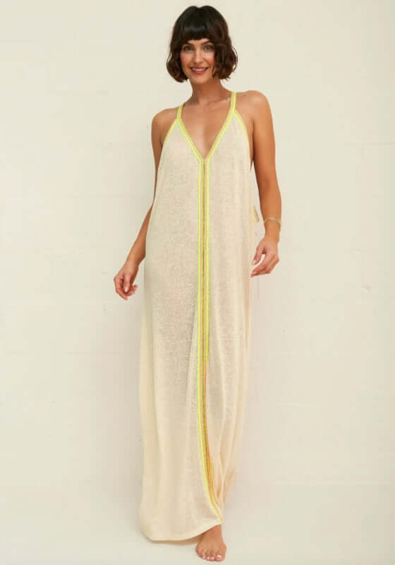 Make a style statement in the gorgeous Inca Sun Dress in Ecru by beachwear designer Pitusa. Made from soft semi sheer jersey, it has a beautiful embroidered panel round the neckline and middle of dress giving it a pop of colour.  Available in 2 sizes - Petite and Standard.