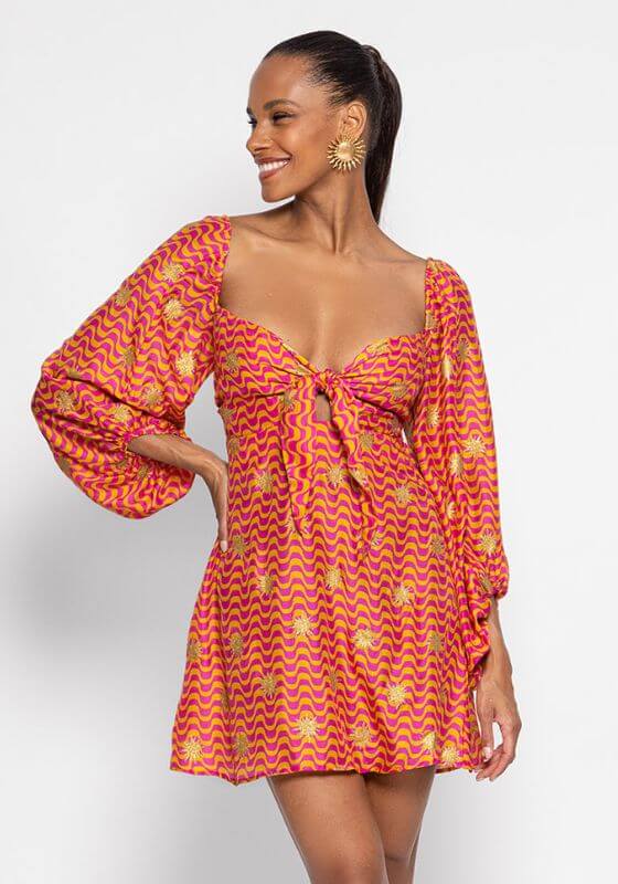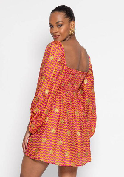 The Ingrid by designer Sundress is a bustier style dress in their Arizona print in fuchsia and orange adorned by gold sun glitter. Featuring flared sleeves, sweet-heart neckline , the bustier has a knot on the front as a finishing touch.  Model wears XS/S and she is 175 cm/ 5'09"  53% modal 47% viscose