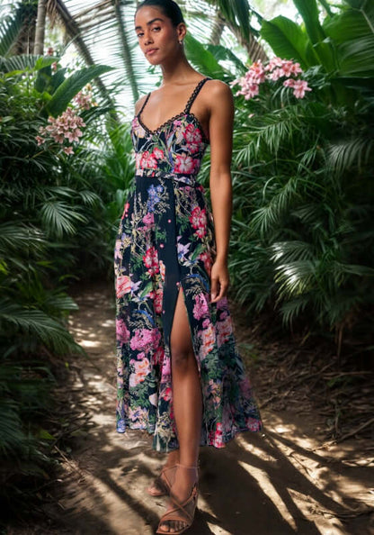 Get ready to feel effortlessly beautiful in the Iraso Long Dress Black Botanical by resortwear designer Charo Ruiz. Featuring a V-neckline adorned with geometric guipure, spaghetti straps, and a long, sinuous skirt with handmade spring motifs, this cotton dress is perfect for any occasion of the season. Embrace your feminine silhouette and make a statement.