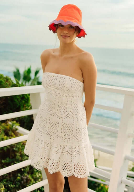 The perfect daytime summer dress has arrived! The Ivana Dress in White by resortwear designer Sundress, this beautiful strapless summer dress features a pineapple eyelet detail with a ruched back for the ultimate fit and a flattering tired skirt finished with a gathered flounce detail along the bottom. The perfect new addition to your summer dress collection.