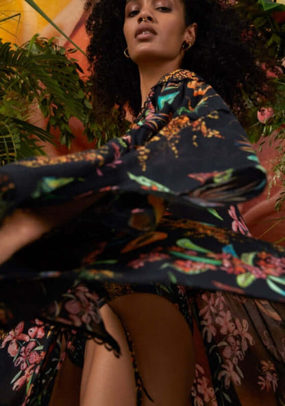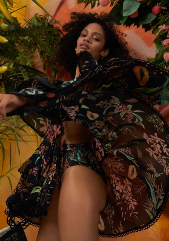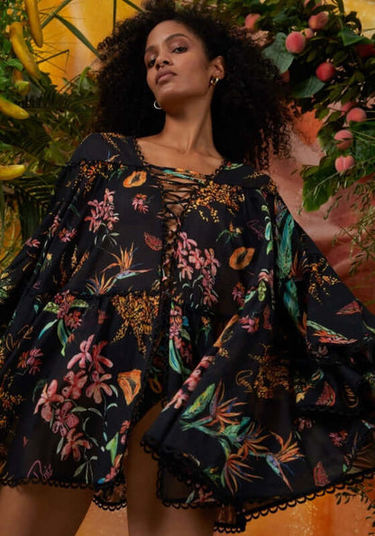 Your new go to summer Kaftan, the Ivet Kaftan in Black Fresca by resortwear designer Charo Ruiz. This breathable flowing kaftan features a lace up V neck with flared sleeves in a beautiful floral and fruit print. Perfect to elevate and compliment a simple bikini on your next beach get away.