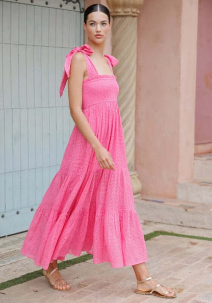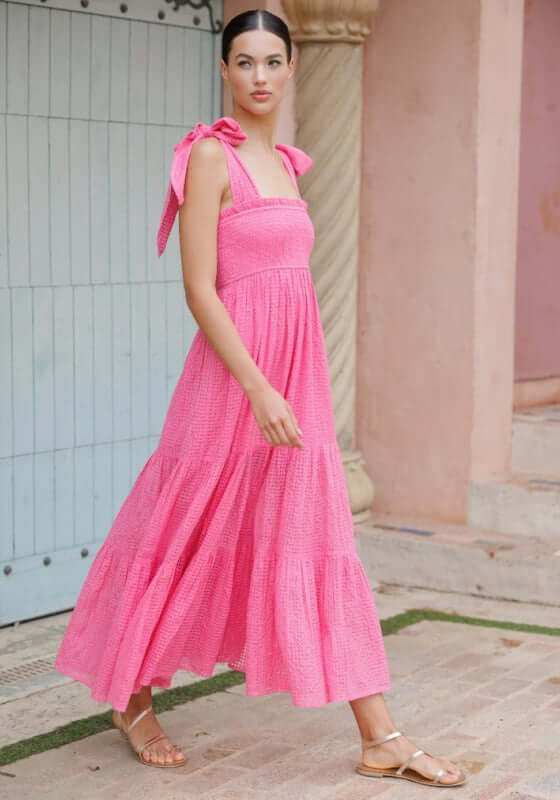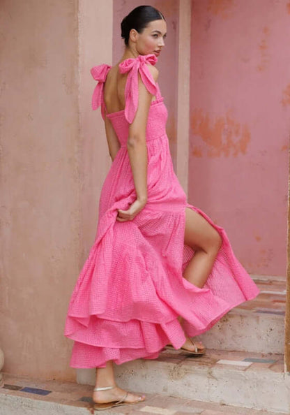 Look chic in the beautiful Jade Dress in Pink Gingham by Resortwear designer Sundress. Made from woven gingham fabric, this statement maxi dress features a ruched bodice with wide shoulder tie straps, falling to a flared skirt with ruffle trim and slit to the thigh.