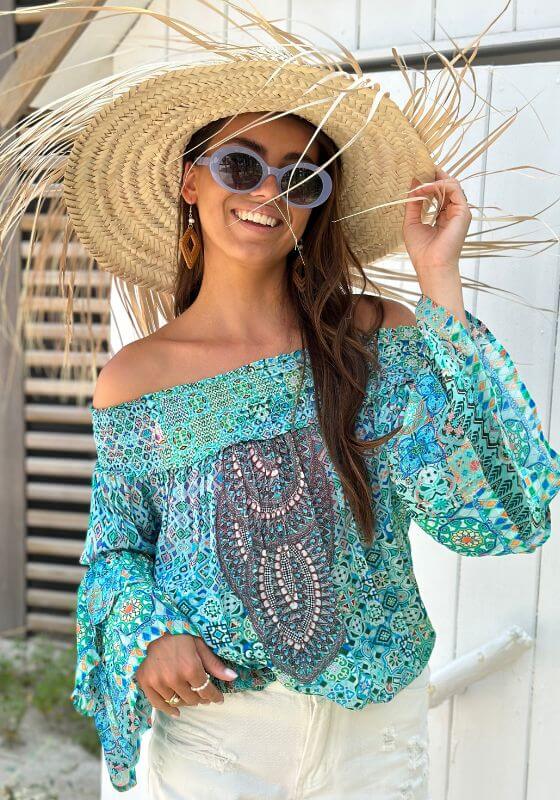 The Jessie Top by Resortwear Designer Valery Vain in Aquarius features a mosaic inspired blue and green pattern with hints of orange. Features an elasticated off the shoulder neckline and tiered flared long sleeves. Detailed with gem embelishments.